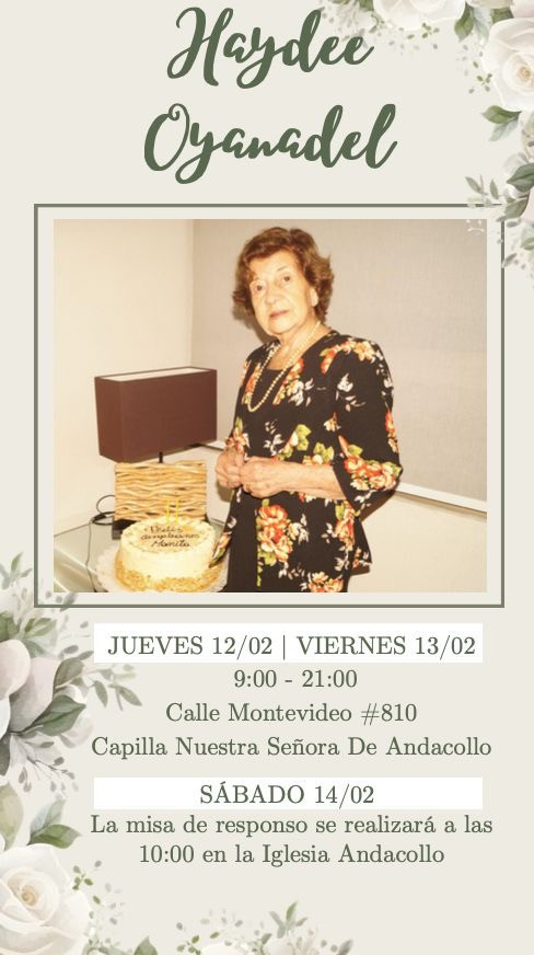 Invitamos a toda la familia, amigos y vecinos a la misa de nuestra querida abuela. 📍 Lugar: Capilla Andacollo, Montevideo 826. 🕙 Hora: 10:00 am. Agradecemos de corazón su compañía y oraciones.